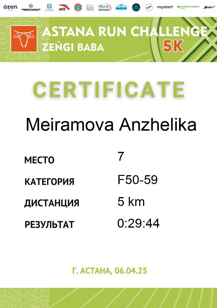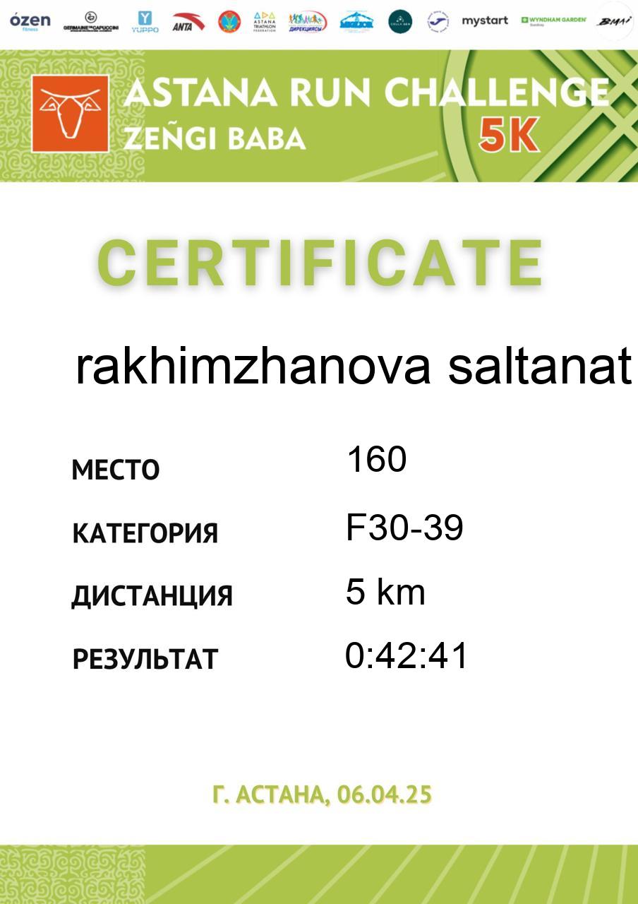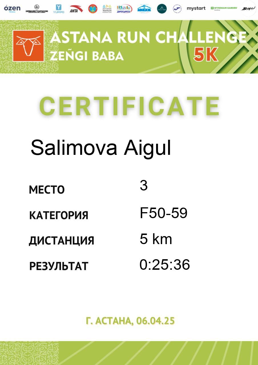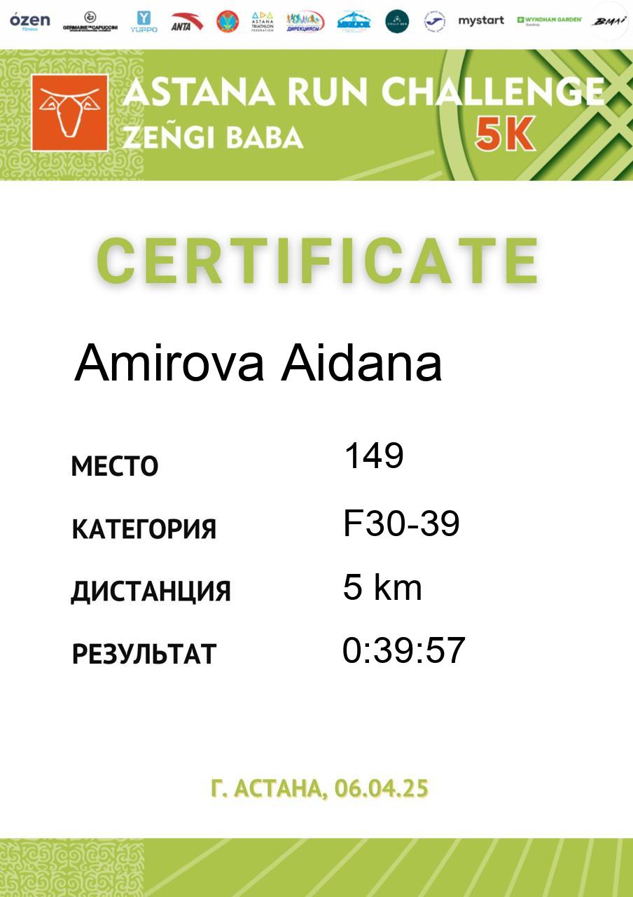 | 58 | Abdildina Tamiris | 5 | F18-29 | 5 km | 0:40:44 | 790 | Скачать |