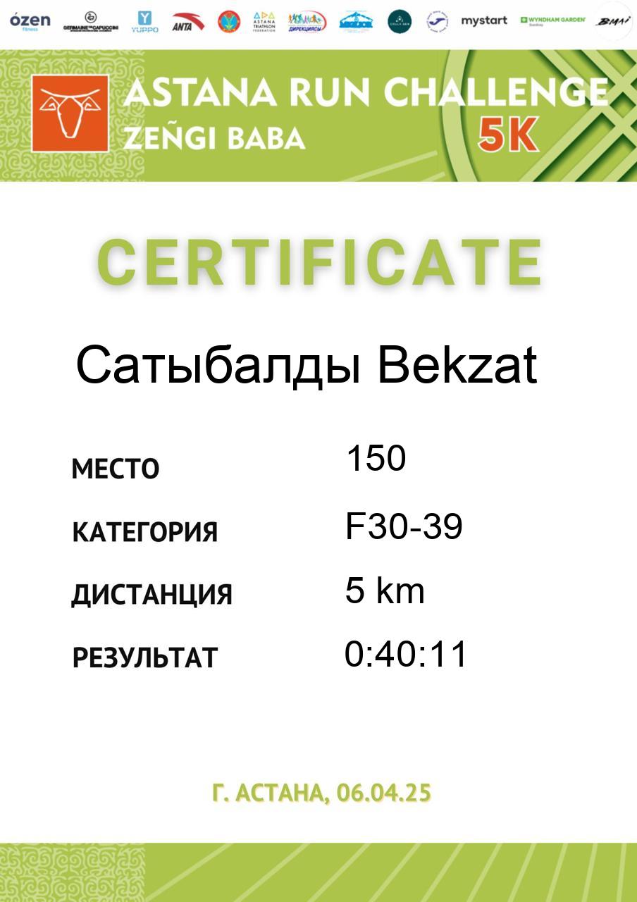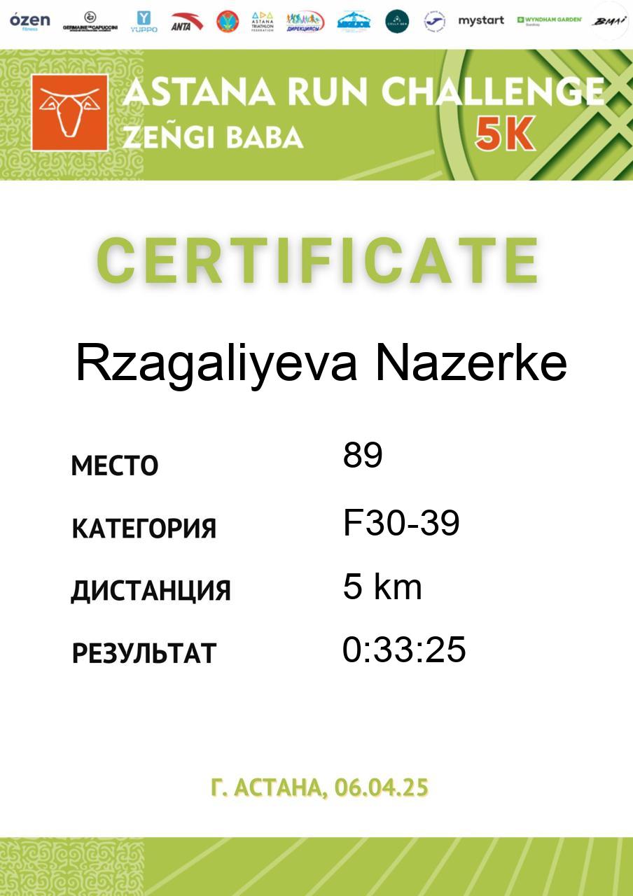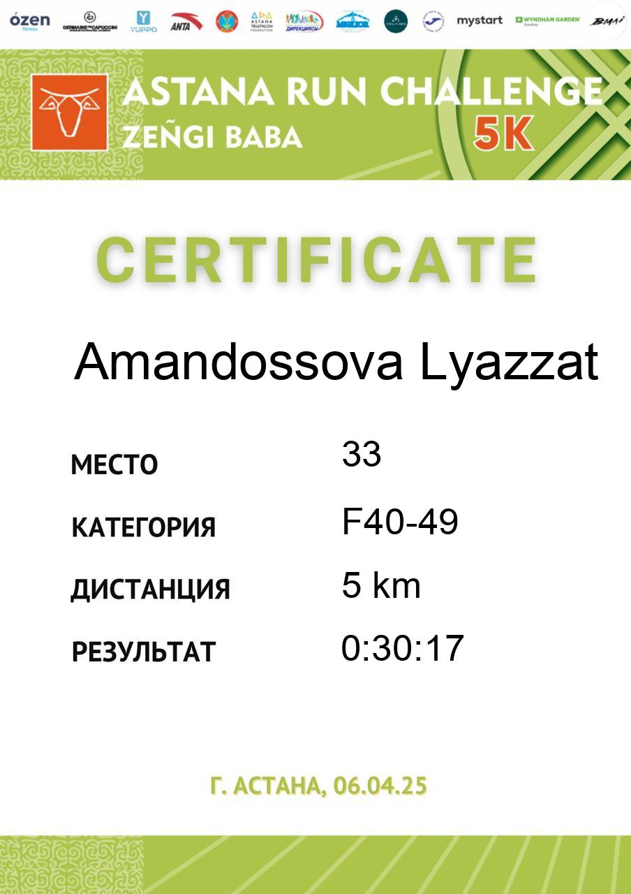 | 58 | Abdildina Tamiris | 5 | F18-29 | 5 km | 0:40:44 | 790 | Скачать |