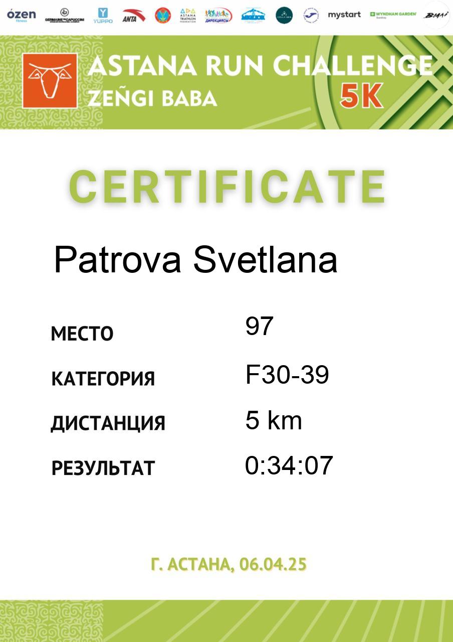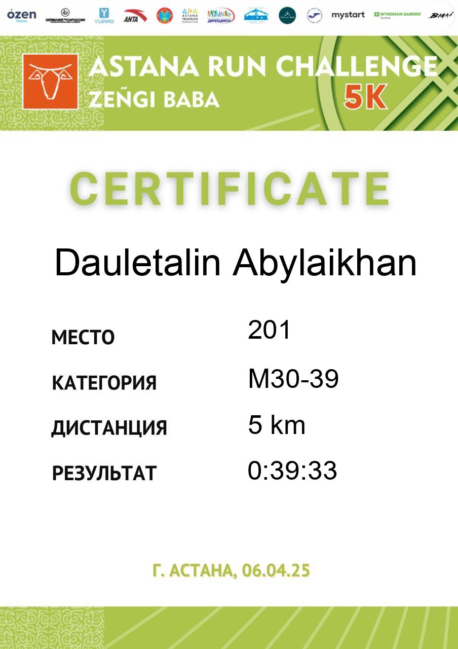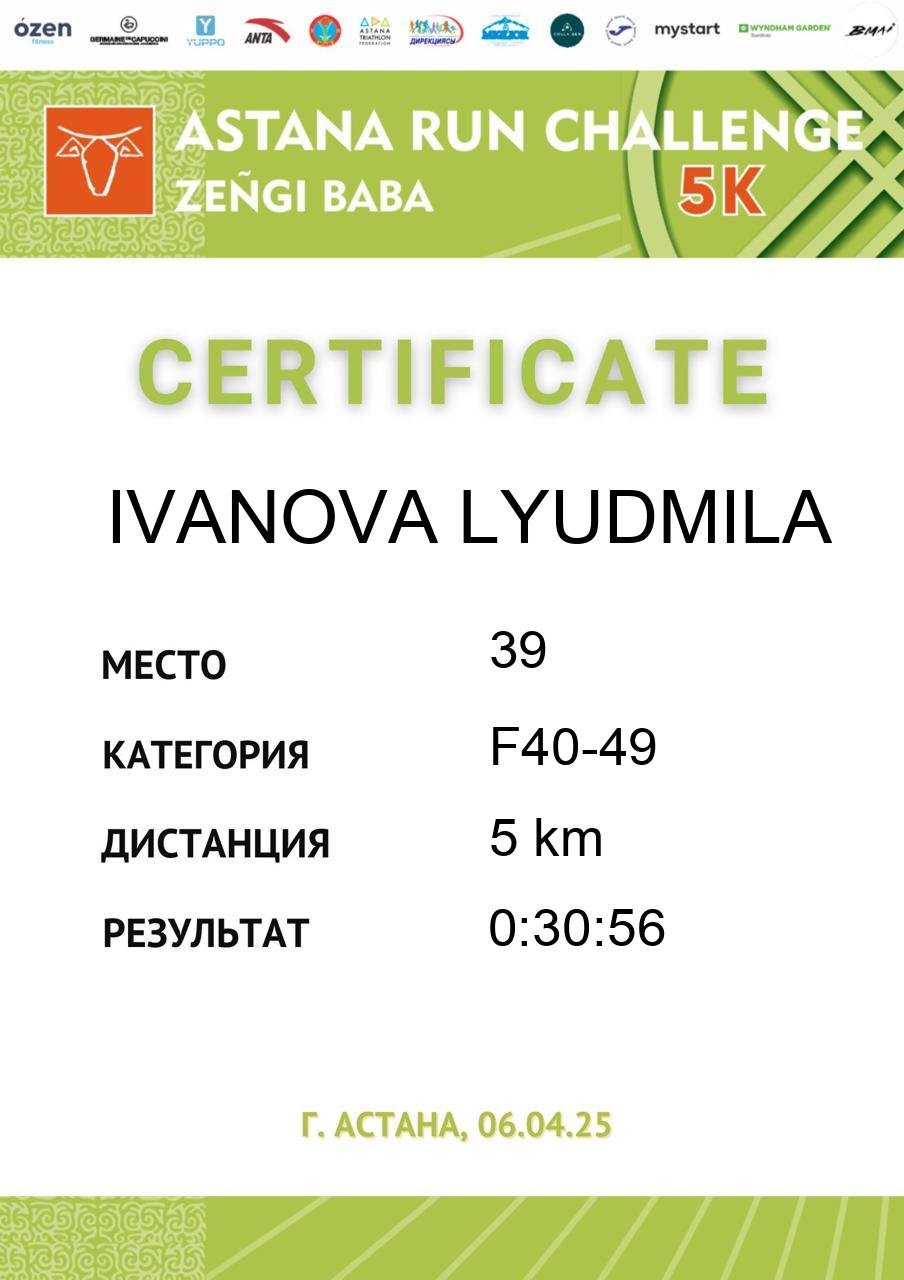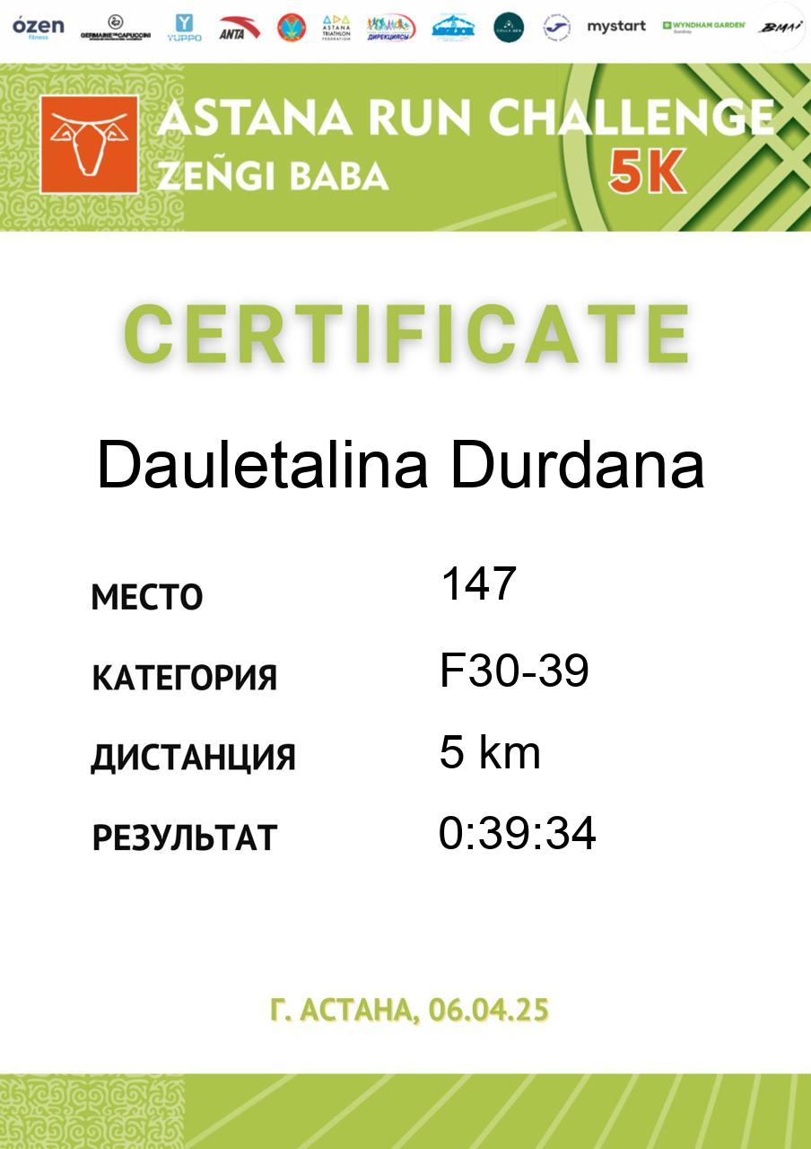| 58 | Abdildina Tamiris | 5 | F18-29 | 5 km | 0:40:44 | 790 | Скачать |