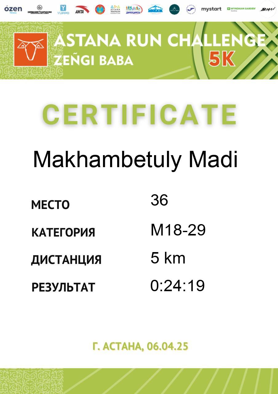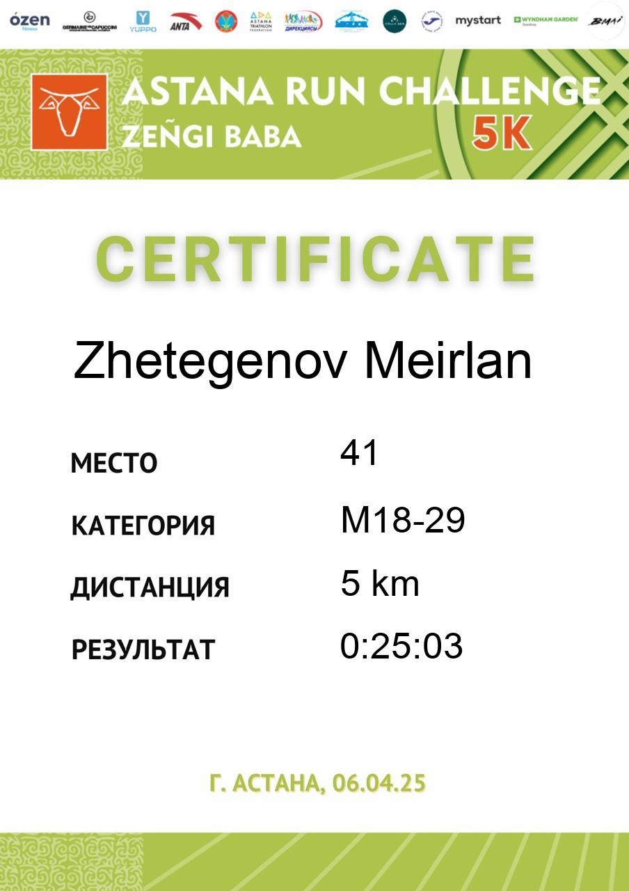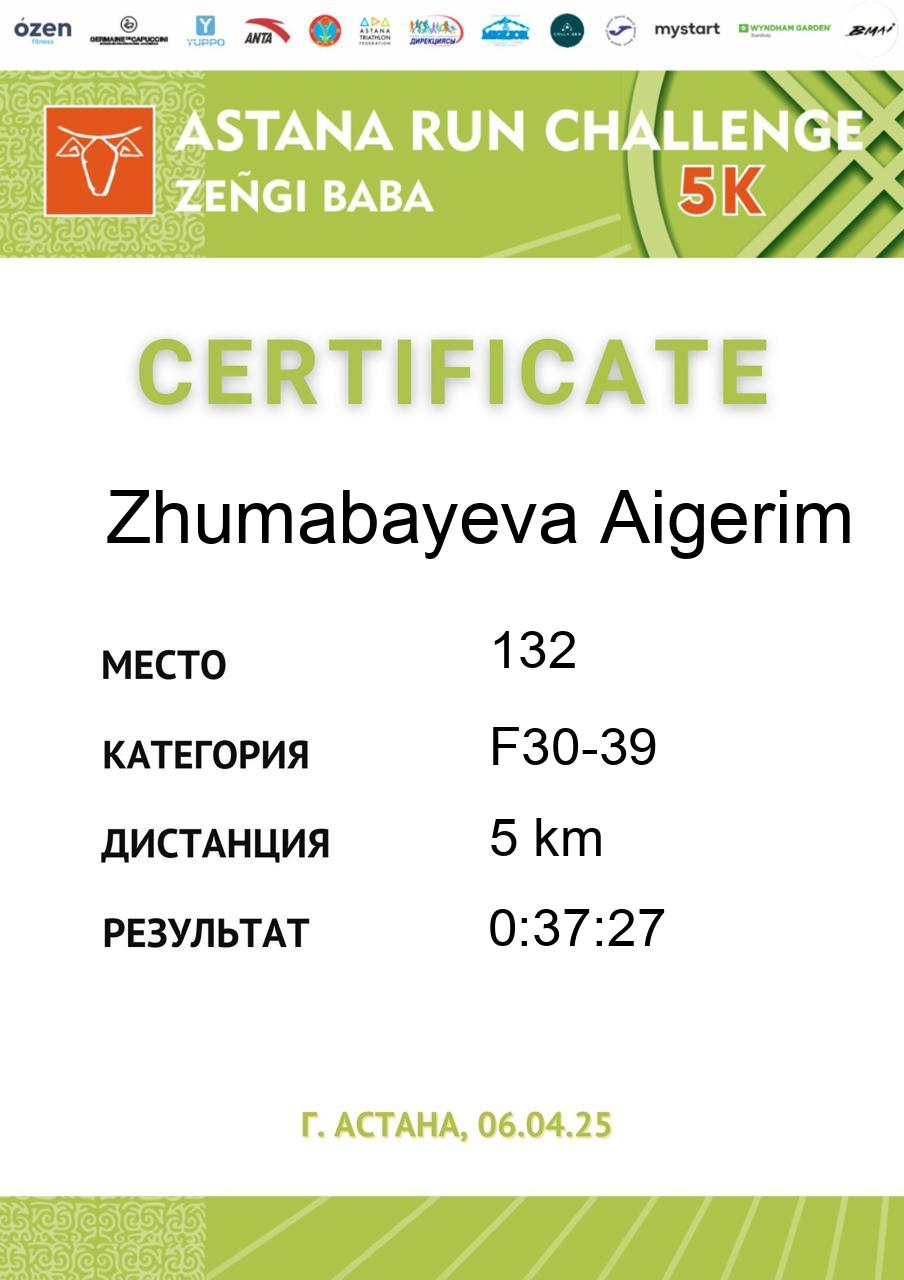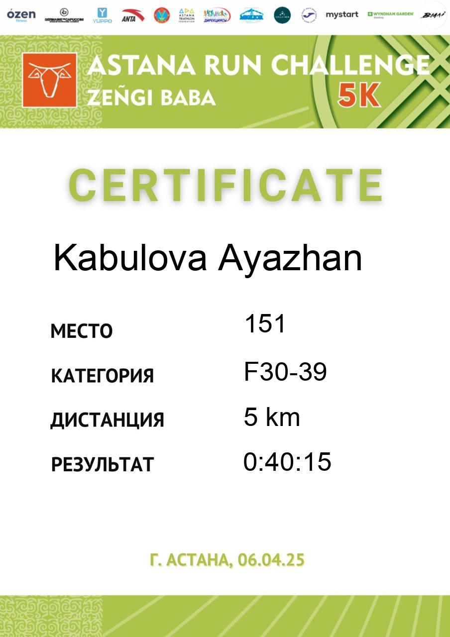 | 5 | Bakhytzhankyzy Madina | 126 | ВК | 5 km | 0:41:39 | 797 | Скачать |