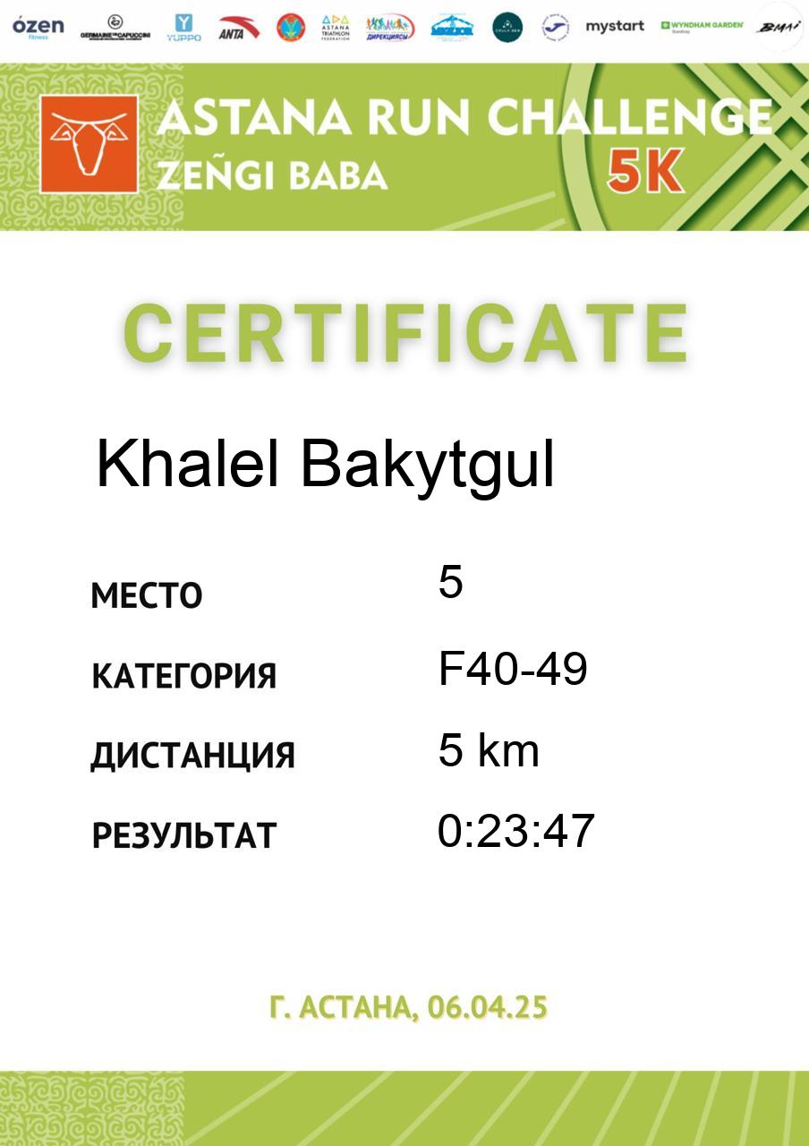 | 12 | Bazarbekkyzy Altynai | 146 | F30-39 | 5 km | 0:23:07 | 157 | Скачать |