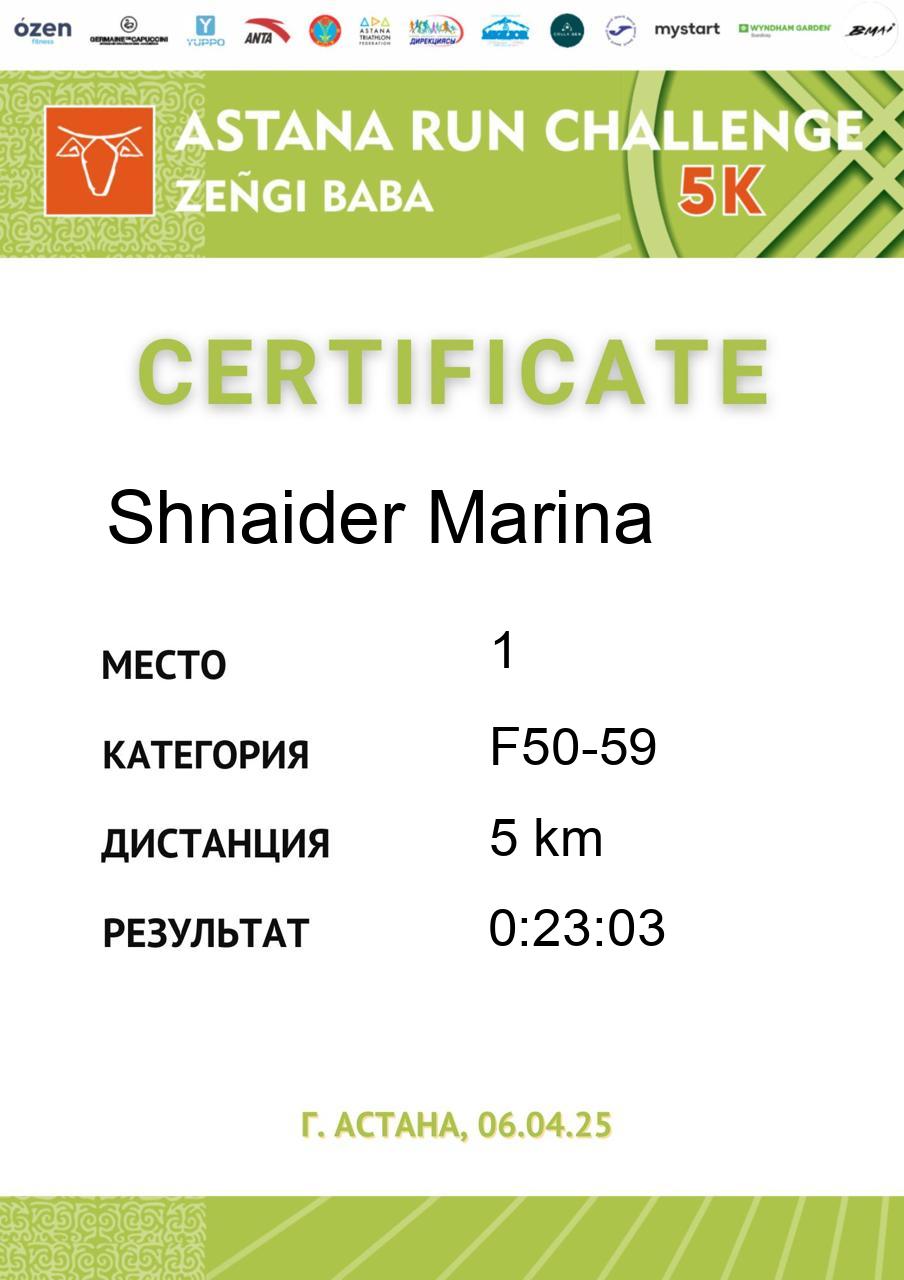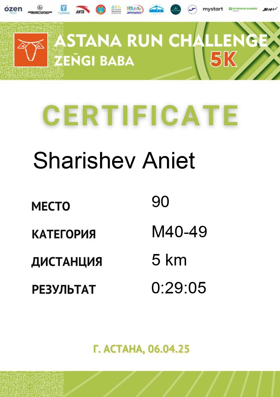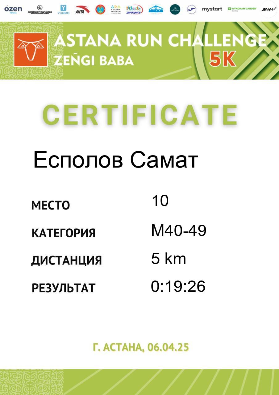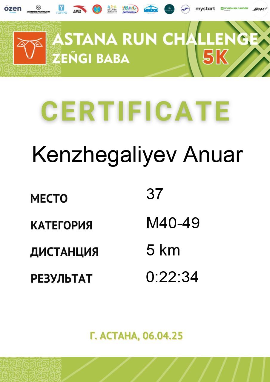 | 5 | Gali Dinmukhammed | 255 | M50-59 | 5 km | 0:21:37 | 91 | Скачать |