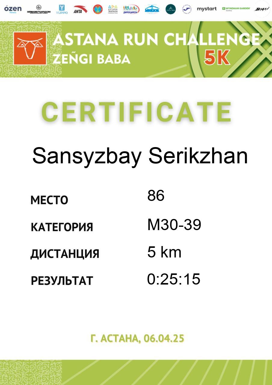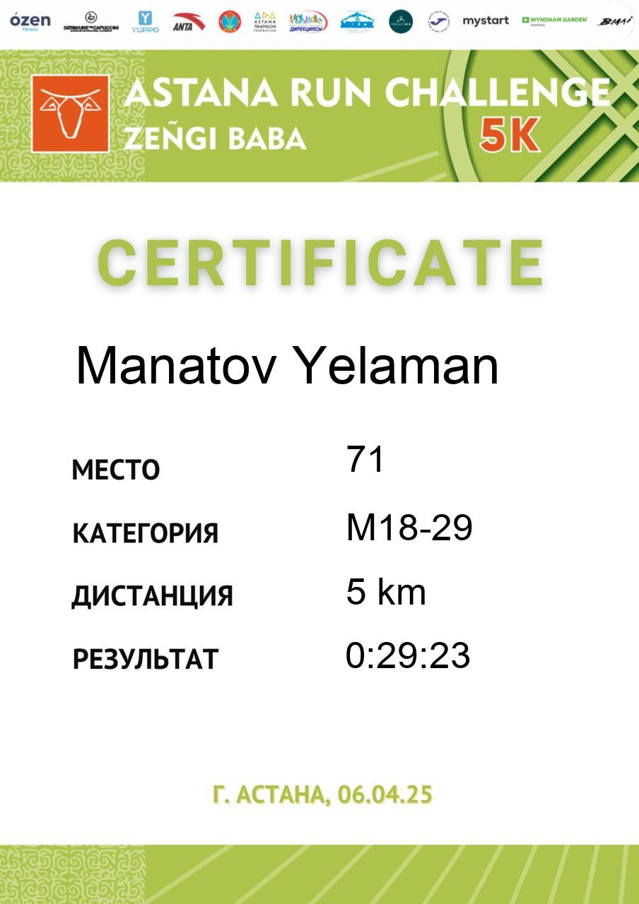 | 8 | Mendybayev Ваkntiyar | 477 | M50-59 | 5 km | 0:23:43 | 183 | Скачать |