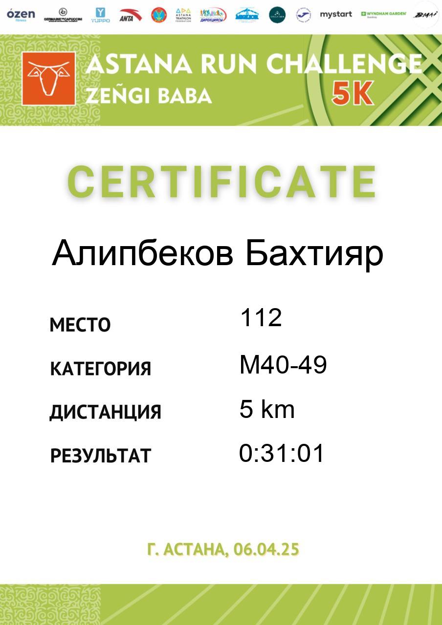 | 115 | Bakhvayev Yermek | 125 | M40-49 | 5 km | 0:31:14 | 515 | Скачать |