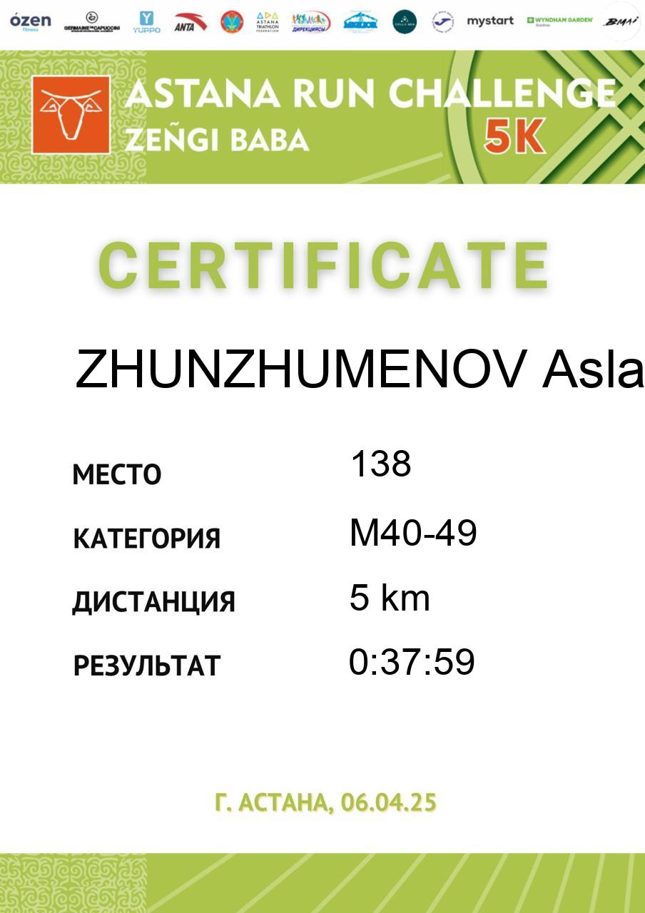 | 138 | ZHUNZHUMENOV Aslan | 807 | M40-49 | 5 km | 0:37:59 | 740 | Скачать |