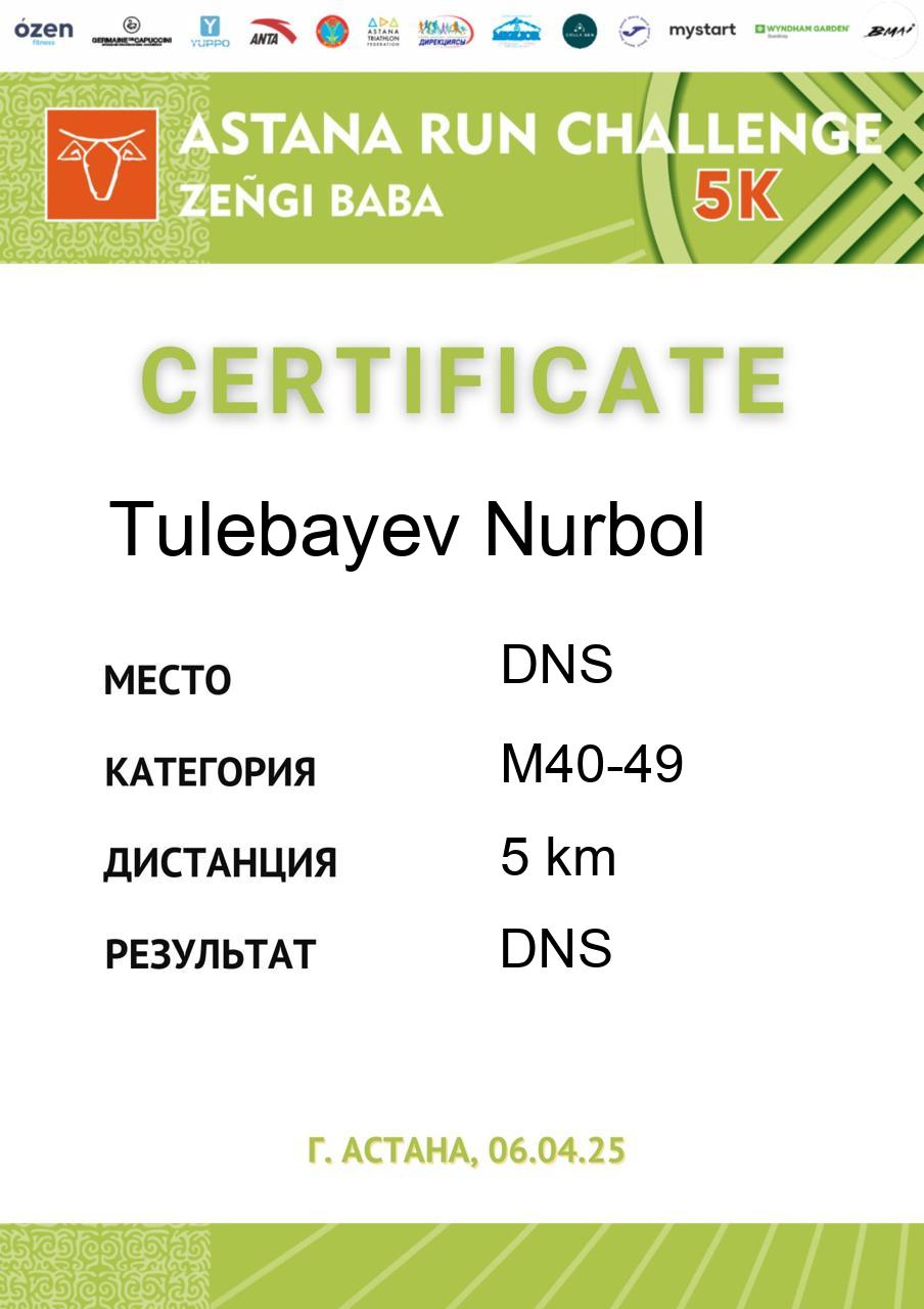 | DNS | Tulebayev Nurbol | 714 | M40-49 | 5 km | DNS | DNS | Скачать |