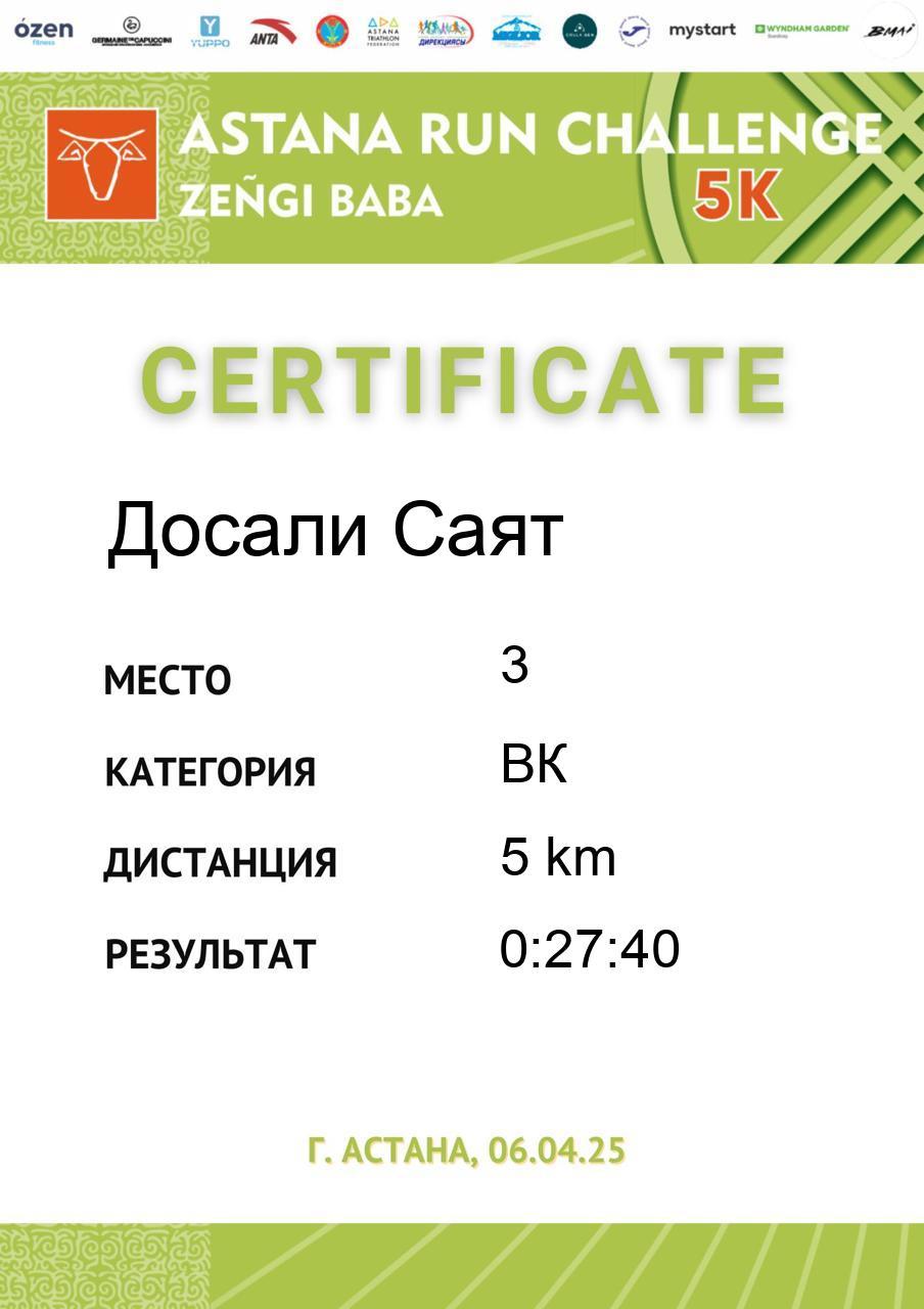 | 3 | Досали Саят | 229 | ВК | 5 km | 0:27:40 | 343 | Скачать |