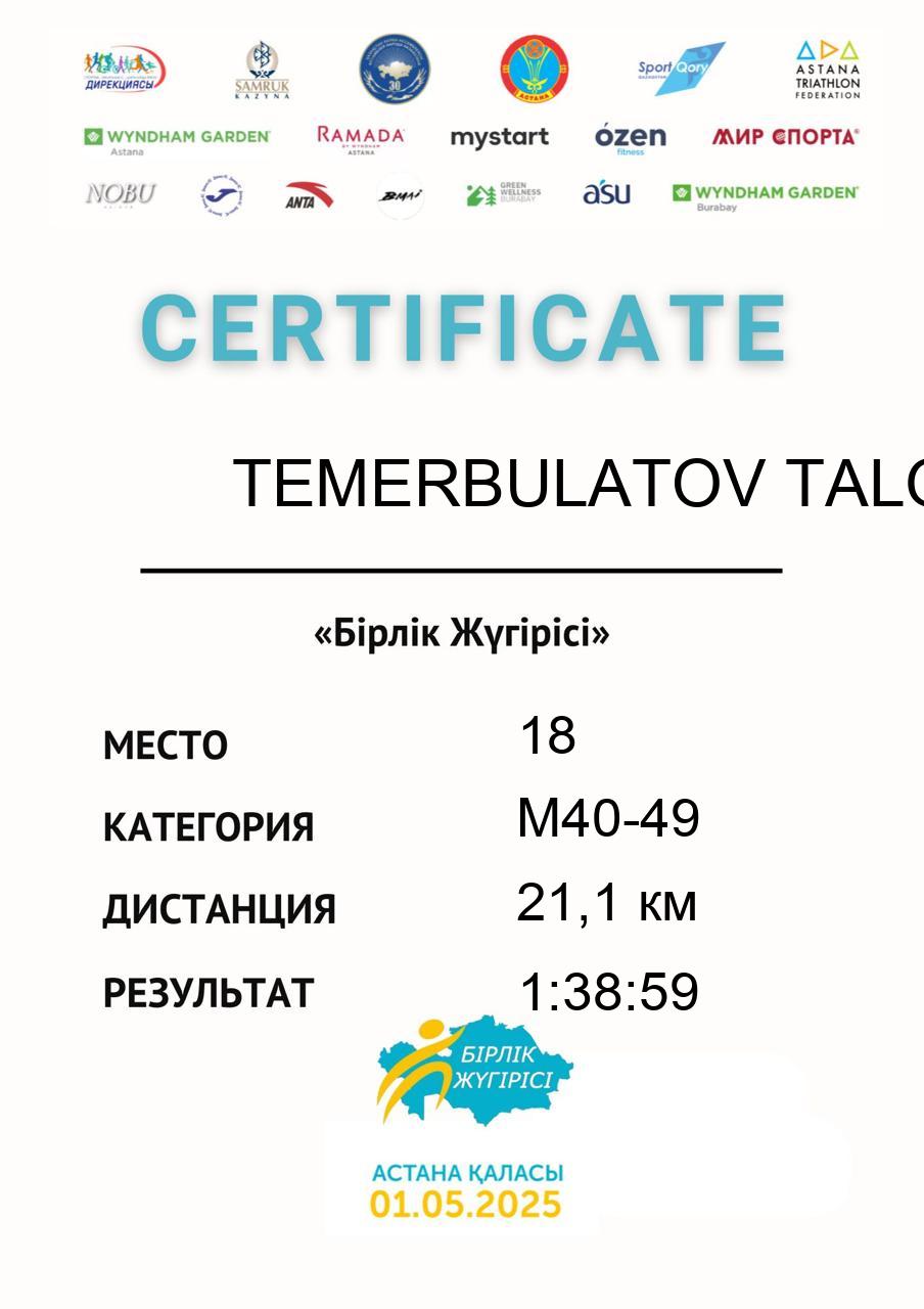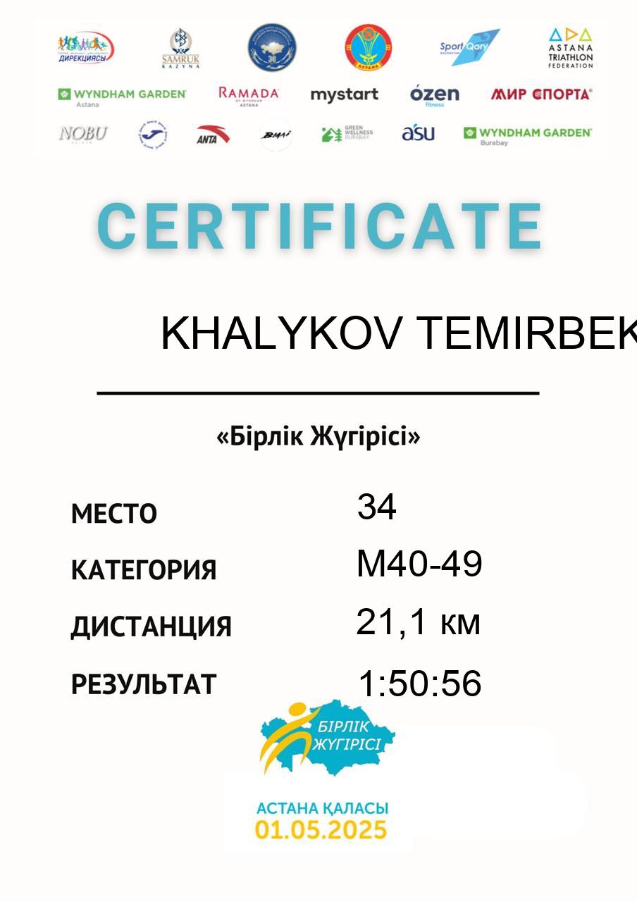 | 34 | KHALYKOV TEMIRBEK | 4072 | M40-49 | 21,1 км | 5:15 | 1:50:58 | 1:50:56 | Скачать |