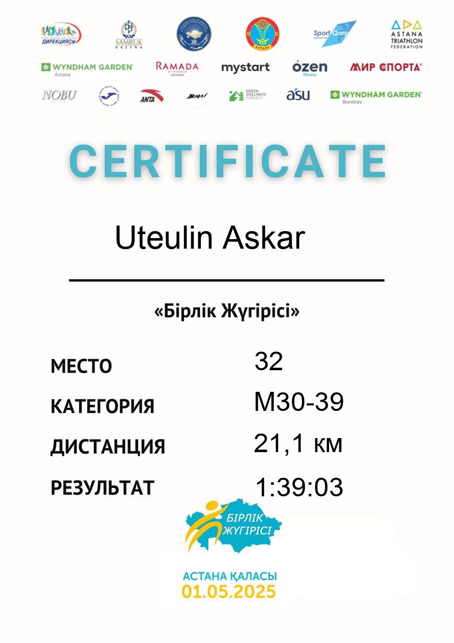 | 49 | Uteulov Beibit | 4167 | M30-39 | 21,1 км | 5:10 | 1:49:08 | 1:49:08 | Скачать |