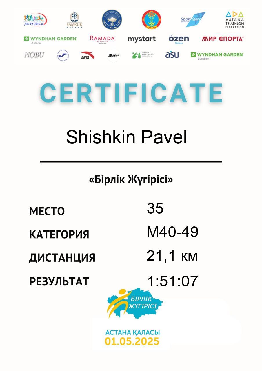 | 45 | Kabyshev Zhannur | 4062 | M30-39 | 21,1 км | 5:06 | 1:47:48 | 1:47:38 | Скачать |