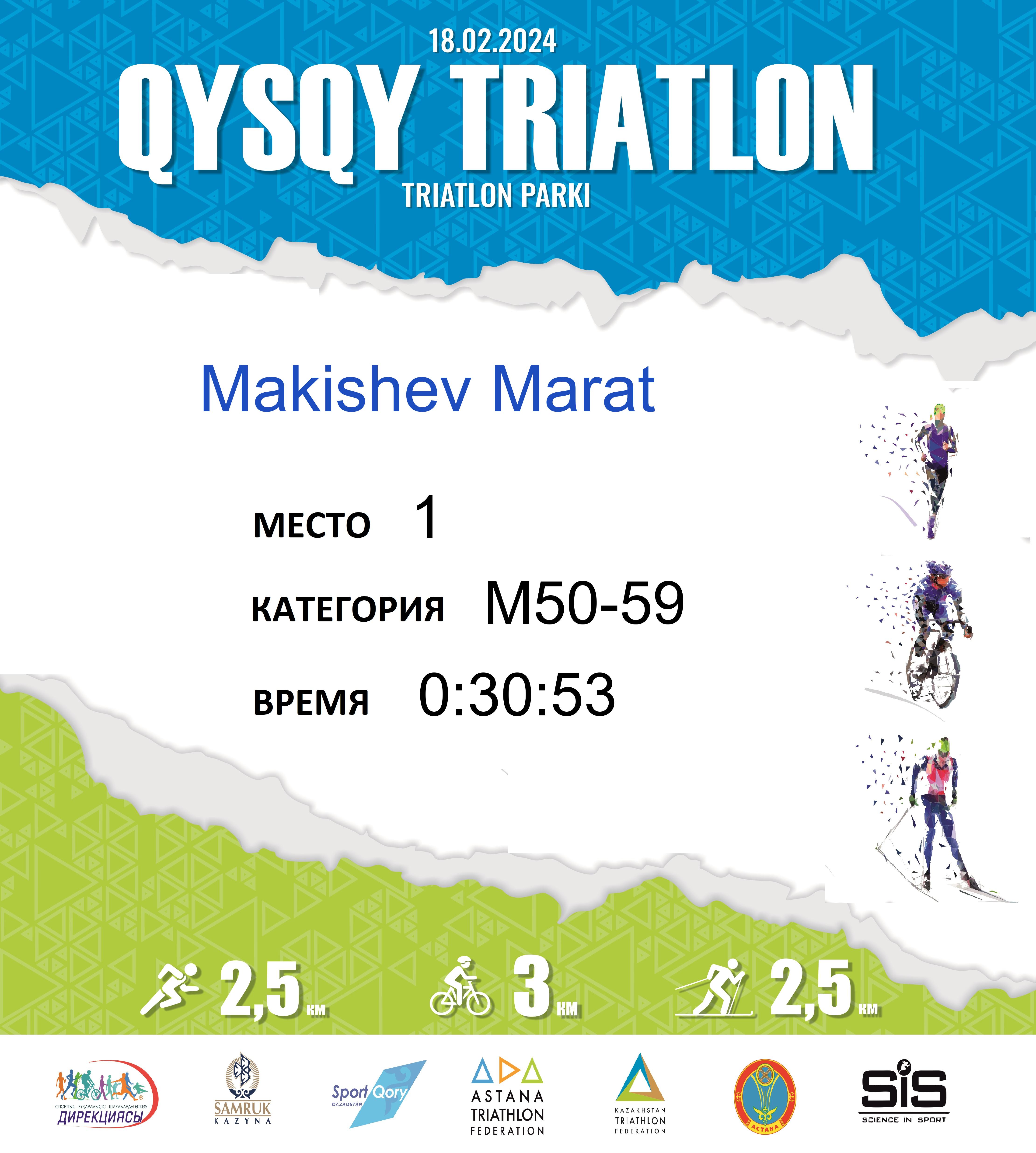 | 1 | Makishev Marat | 143 | M50-59 | 17 | 0:30:53 | Скачать | |